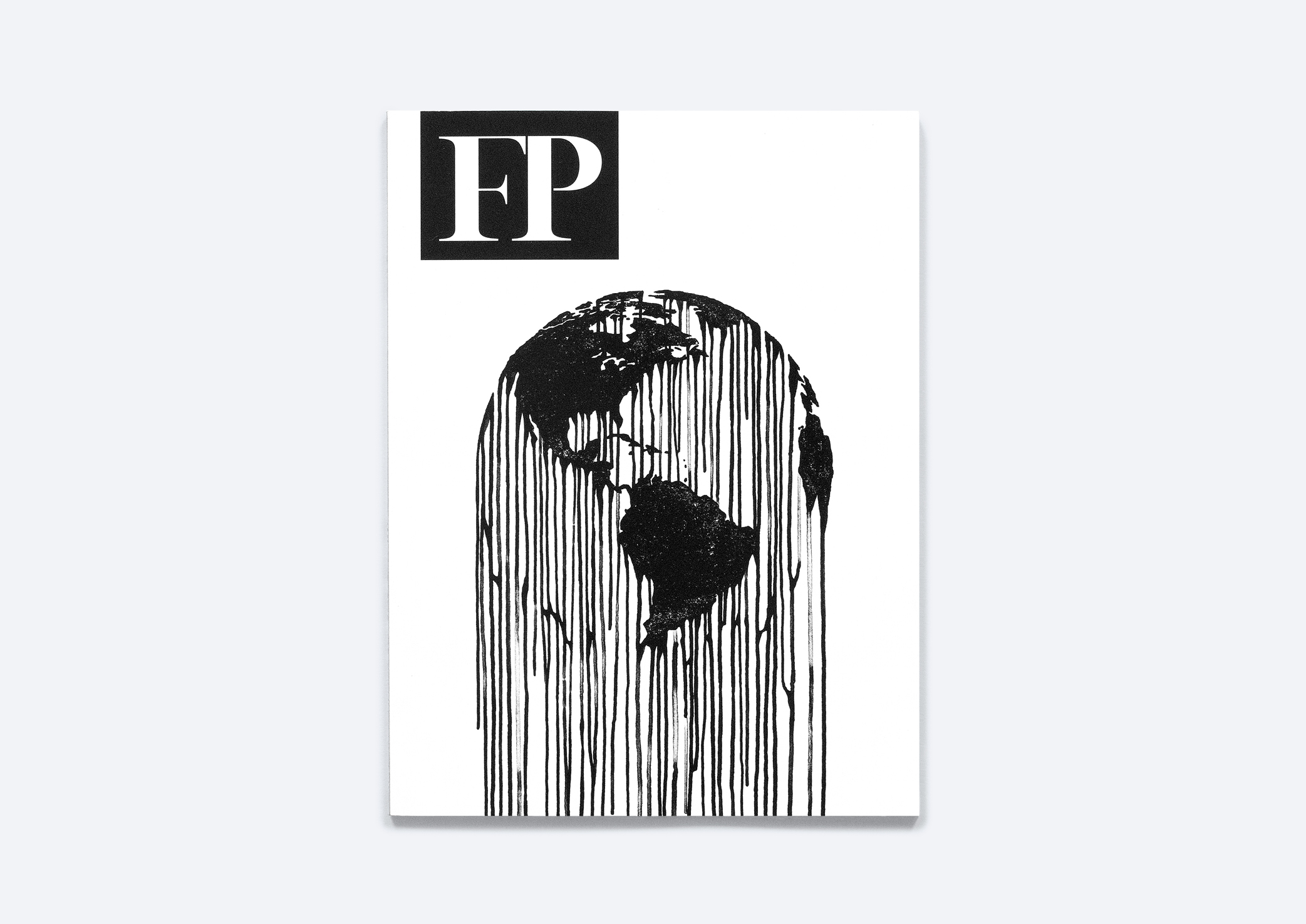 Later on, we undertook a proper blue-sky process and complete rethink of the magazine, preserving some existing departments while adding new additions—including more departments where visuals take the lead—and redefining the front and back of book. We worked with Margaret Swart, a legendary editorial designer and art director, who handled the bulk of the page redesign in addition to modernizing the “FP” insignia, and introduced a new display face, Dala Moa, to the mix. To emphasize FP’s commitment to the power of the visual, the cover for the debut of the redesign issue contained no cover lines—just a stark, black and white illustration of a globe melting away, for the theme of climate change.