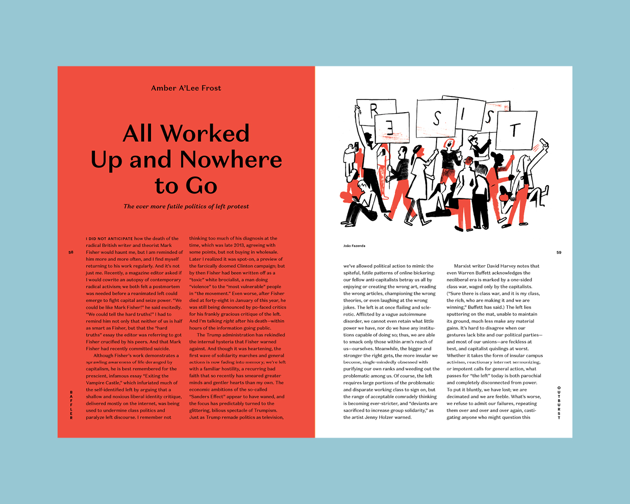 The Baffler has such unique roots compared to other publications, being born out of zine culture, thumbing their noses at elite, intellectual gatekeeping and co-option of alternative subcultures for mass consumerism, all packaged with an irreverent attitude. After 25+ years, the editors felt it was time for The Baffler to modernize its design and ‘grow up’ without selling out, so they turned to Eddie Opara's team at Pentagram, who equipped them with a clean, paired down template of contemporary typefaces to identify various sections, and a gallery-like approach to the art.
